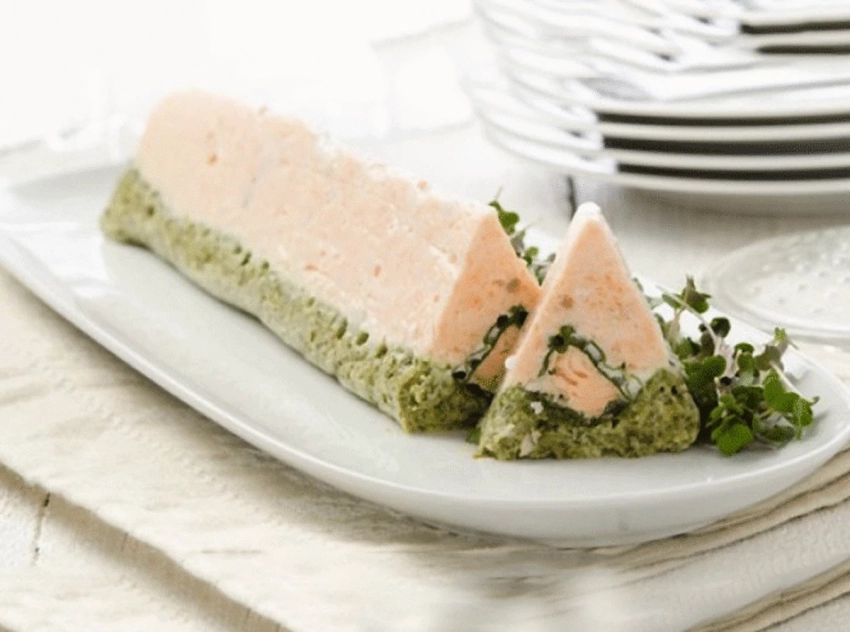 В пищевой пленке выстелите форму, выложите массу из лосося, сверху — начинку из шпината.