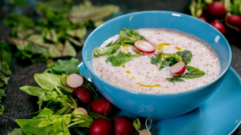 Этот суп напоминает соус дзадзики, но менее густой. Прекрасный выбор для тех, кто хочет лёгкий обед с пикантной ноткой. Йогурт и редис — отличное сочетание белка и витамина C.