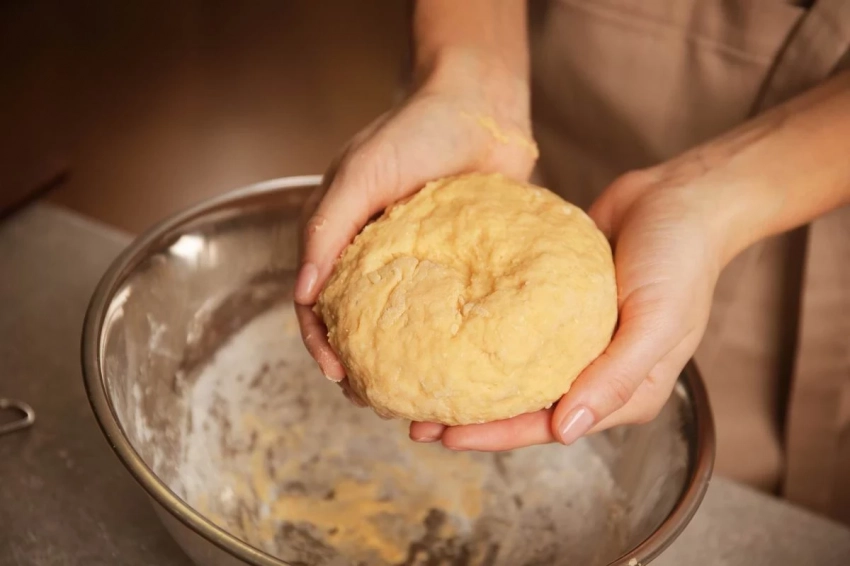 Тесто для мандриков готовится на основе классического песочного теста. Для начала нарежьте холодное сливочное масло небольшими кубиками или натрите на крупной терке. Соедините масло с сахаром и тщательно перемешайте. Затем добавьте яйца и замесите смесь руками до однородности. Постепенно всыпьте муку вместе с разрыхлителем и замесите нежное, но не липнущее тесто. Важно не вымешивать слишком долго, чтобы выпечка осталась мягкой и рассыпчатой.