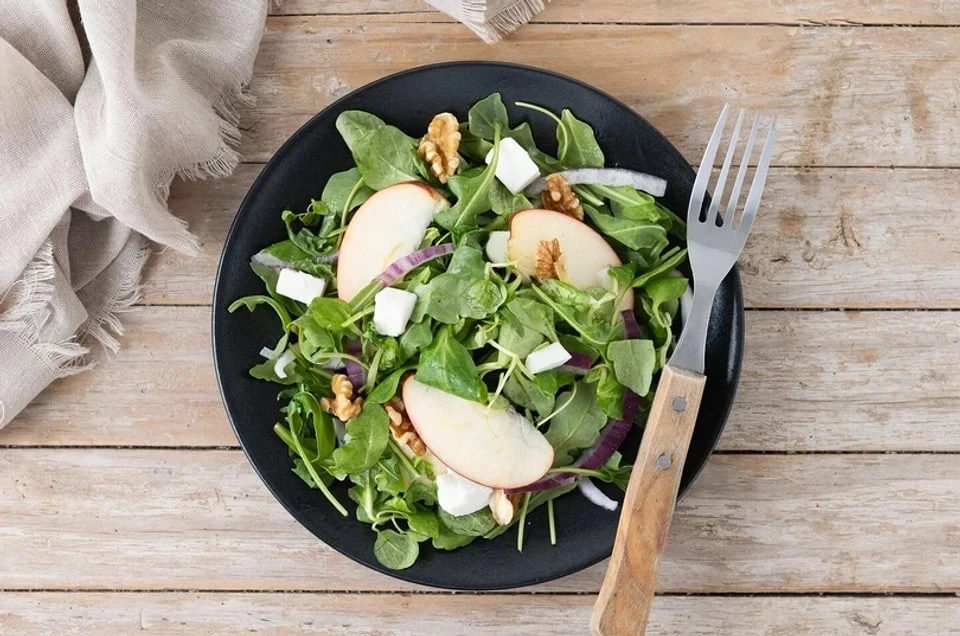 На тарелку выложи зелень, сверху — овощи и сыр. Для соуса взбей горчицу с маслом и уксусом, добавь эстрагон. Полей салат перед подачей.