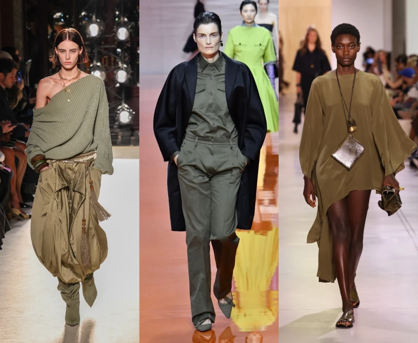 В коллекциях 2026 года оливковый появляется в самых разных фактурах: у Balmain — в мягком атласе и трикотаже, у Dior — в шерсти и коже, у Michael Kors — в женственных силуэтах с акцентом на комфорт.