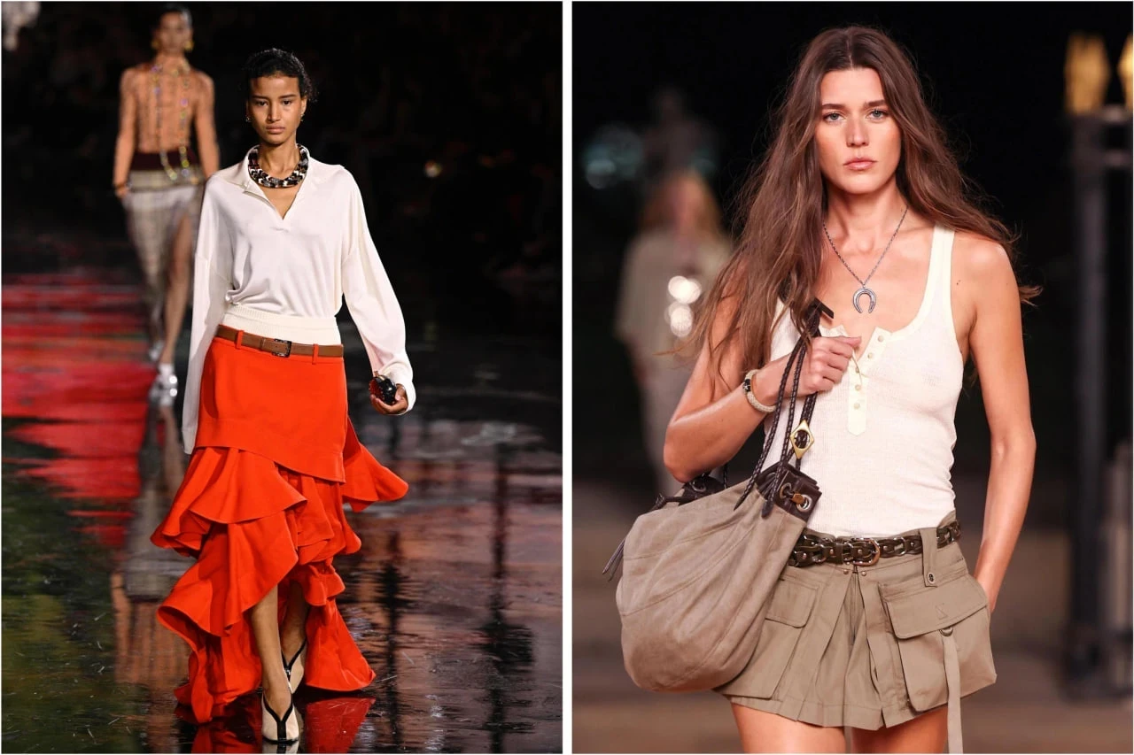 Стиль сафари снова в центре внимания. Юбки в оттенках хаки с накладными карманами, ремнями и плотными тканями отсылают к утилитарной эстетике, но при этом остаются женственными.