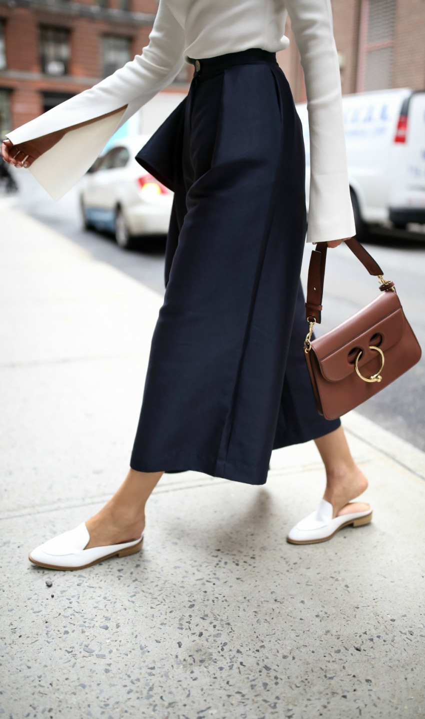 С кюлотами мюли выглядят выигрышно. Этот комплект не только добавляет современности вашему образу, но и визуально вытягивает силуэт, создавая гармонию. Также, мюли отлично сочетаются с джинсами. Предпочтение стоит отдать моделям типа «момских» джинсов или клеш с необработанным низом. Это придаст вашему образу легкости и непринужденности.
