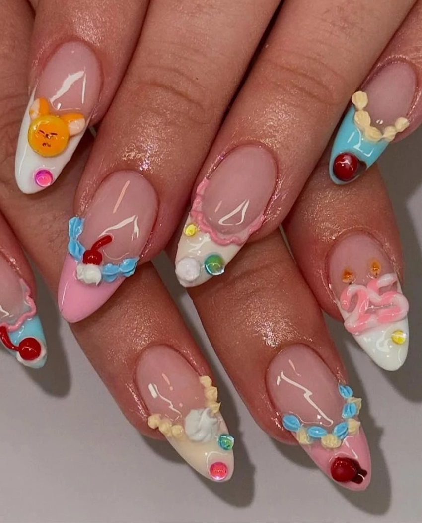 На ногтях всё это воссоздаётся с помощью плотного акригеля, специальных кисточек и 3D-декора — сливочных «пиков», миниатюрных клубничек, леденцов и бусин. Получается мини-десерт, но уже не на тарелке, а на кончиках пальцев. Работы с таким дизайном — кропотливая и далеко не быстрая, зато результат стоит каждого потраченного часа.
