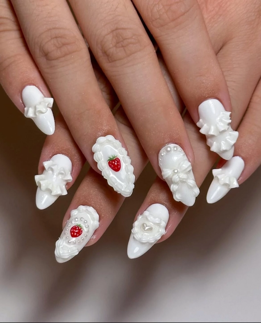 Маникюр в стиле cake nails — это глоток сладкой ностальгии и визуальный кайф одновременно. Подумайте о глазури, сливках, сахарной посыпке, крошках печенья и ягодах — всё это теперь можно встретить… на ногтях! Техника оформления вдохновлена винтажной кондитерской эстетикой под названием «Ламбет», где на торты наносятся причудливые завитки, драпировки и кремовые рюши.