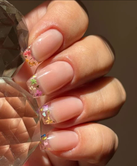 Если классический френч кажется скучным, попробуйте обновить его с помощью сухоцветов. Лепестки можно разместить вдоль линии улыбки или создать эффект «цветущего френча», когда они как бы прорастают с кончиков ногтей.