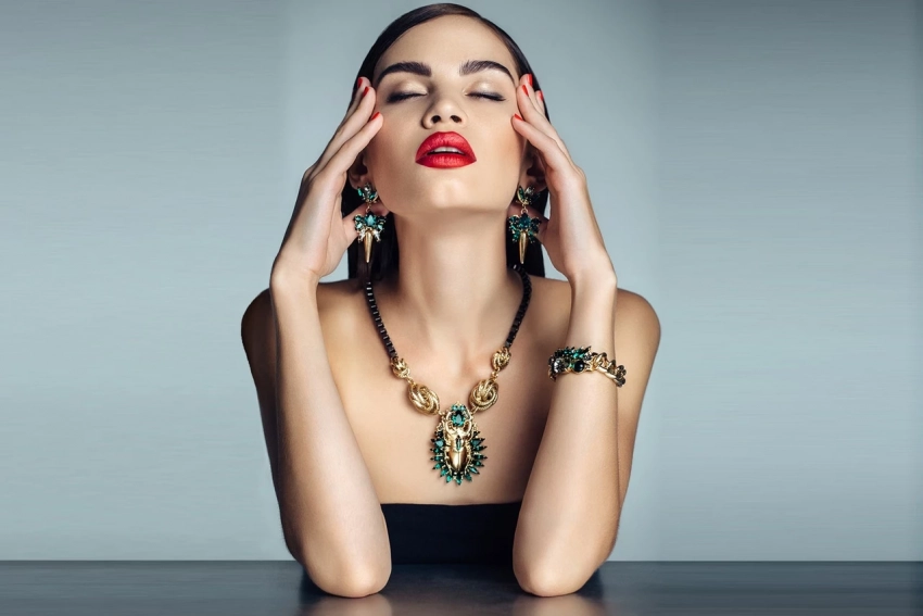 Золото в сочетании с цветными камнями, античные формы и максимум блеска. Чем больше, тем лучше.