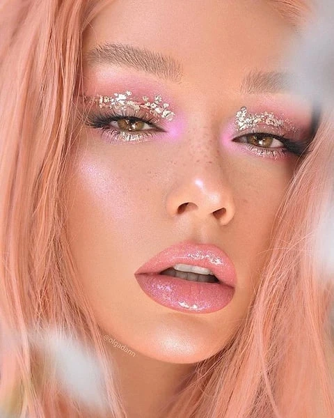 Это не акцент, это центр внимания. Используй крупные блестки в контрастных оттенках: теплые тени — холодный глиттер, и наоборот. Наноси их на липкую базу или вазелин, чтобы они не осыпались. Яркое сияние по центру века, блестки в уголках глаз, на скулах — перебор здесь невозможен.