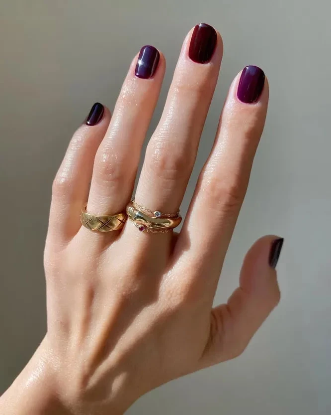 Однотонный глянец. Чистый баклажановый лак без декора — минимализм, который говорит сам за себя.