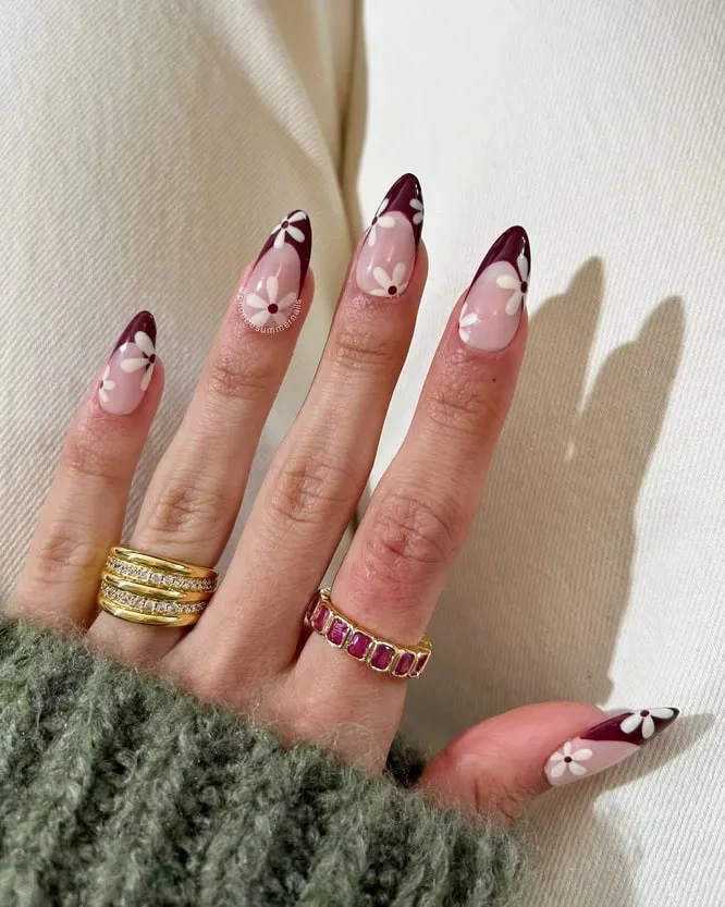 Цветочный нейл-арт. Мелкие белые или розовые цветы на фиолетовом фоне придают образу романтичности.