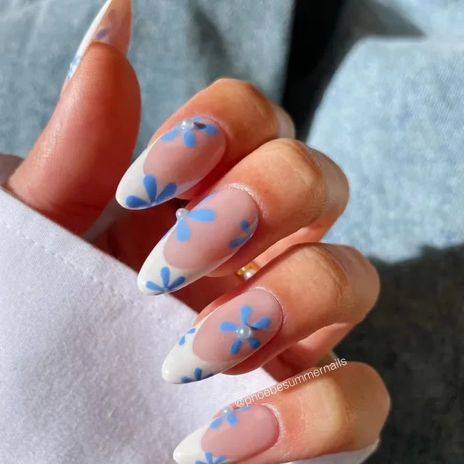 Добавь к классическому френчу цветочные мотивы. Это может быть нежная роспись или стикеры — любой декор сделает маникюр более живым и душевным. Особенно уместен такой дизайн на отдыхе, фестивалях и просто для поднятия настроения.