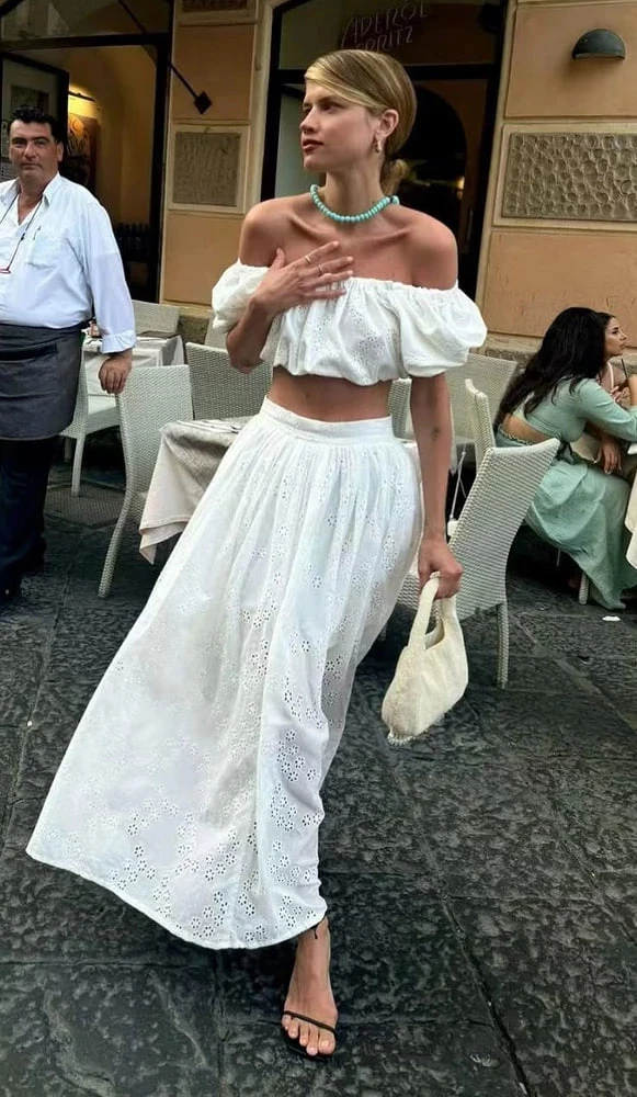 Сейчас в тренде эстетика latina faerie — легкая, воздушная, слегка кокетливая. И белая юбка в сочетании с укороченным топом идеально вписывается в эту стилистику.