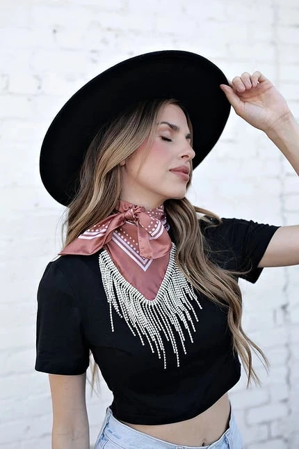 Подходит крупная и плотная бандана. Сложи её по диагонали, оберни грудь и завяжи сзади — получится топ-бандо.