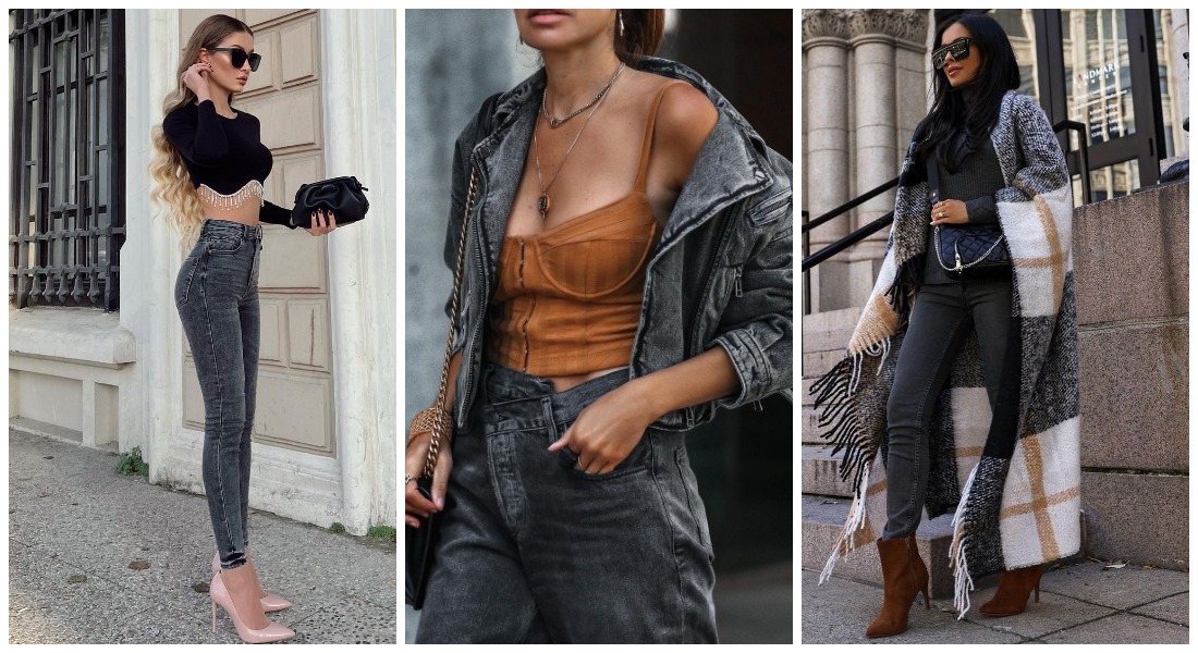 Для особых случаев серые джинсы клеш — отличный выбор. Их можно стильно дополнить белым топом-корсетом, подчеркнув женственность образа, а завершить его стильными туфлями на высоких каблуках и небольшой сумкой.
