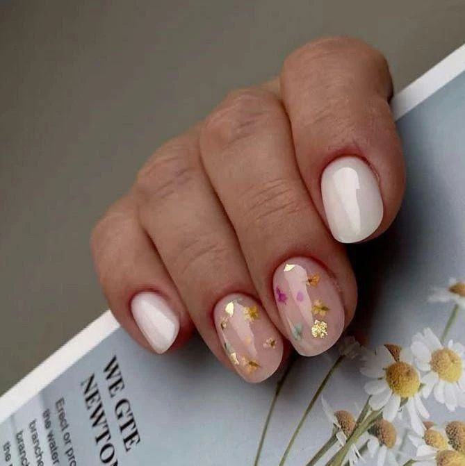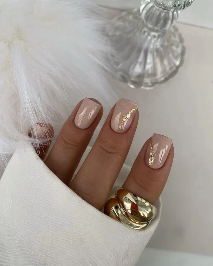 Для любительниц минимализма с изюминкой подойдёт нюдовая база с золотыми вкраплениями. Хлопья создают эффект легкой текстуры, добавляя нотку «невидимой» роскоши. Такой маникюр отлично гармонирует с обручальными кольцами и подходит для летних церемоний под открытым небом.