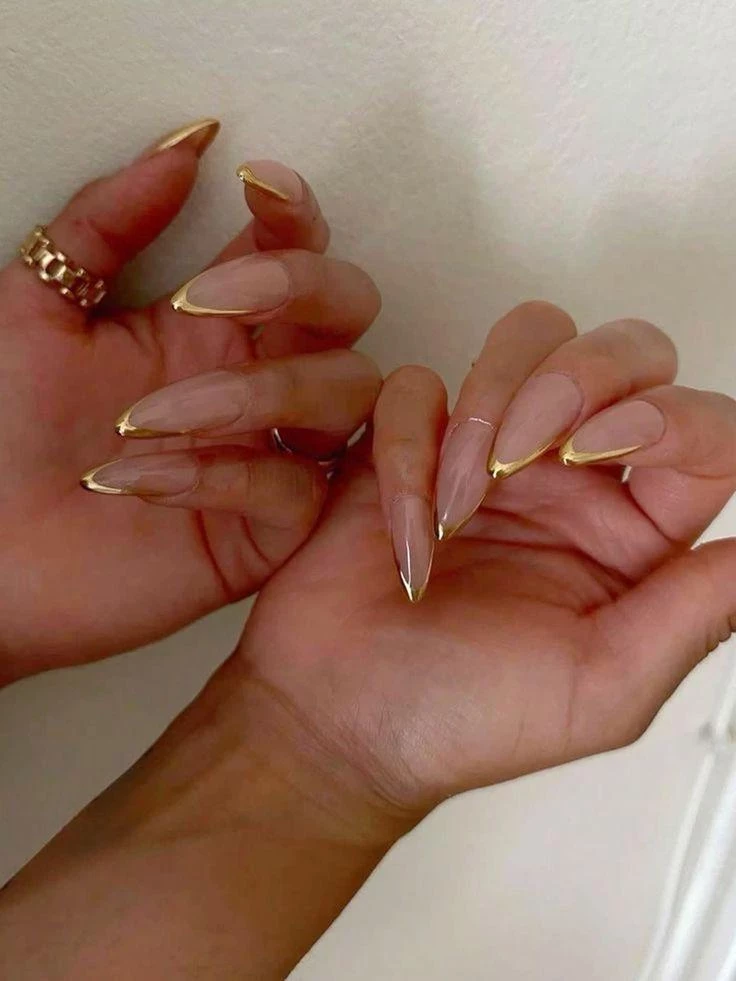 Французский маникюр обретает новое дыхание — теперь с изящными золотыми акцентами. Линия вдоль улыбки или тонкий контур у кутикулы добавляют образу лоск и актуальность. Такой дизайн отлично смотрится с кольцами и браслетами в тёплых металлах.