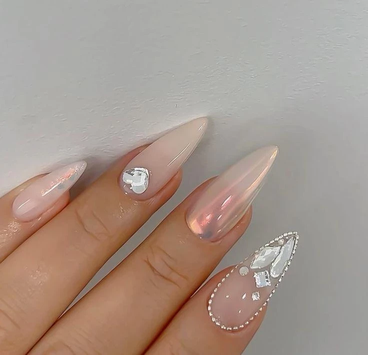 Миниатюрные кристаллы, словно капли росы, размещаются на ногтях в хаотичном порядке. Этот маникюр уместен для вечерней свадьбы, особенно в тандеме с блестящими тканями, пайетками или фатином. Эффект особенно выразителен при свете свечей или фотоспышки.