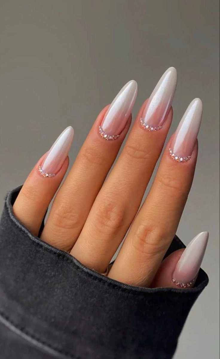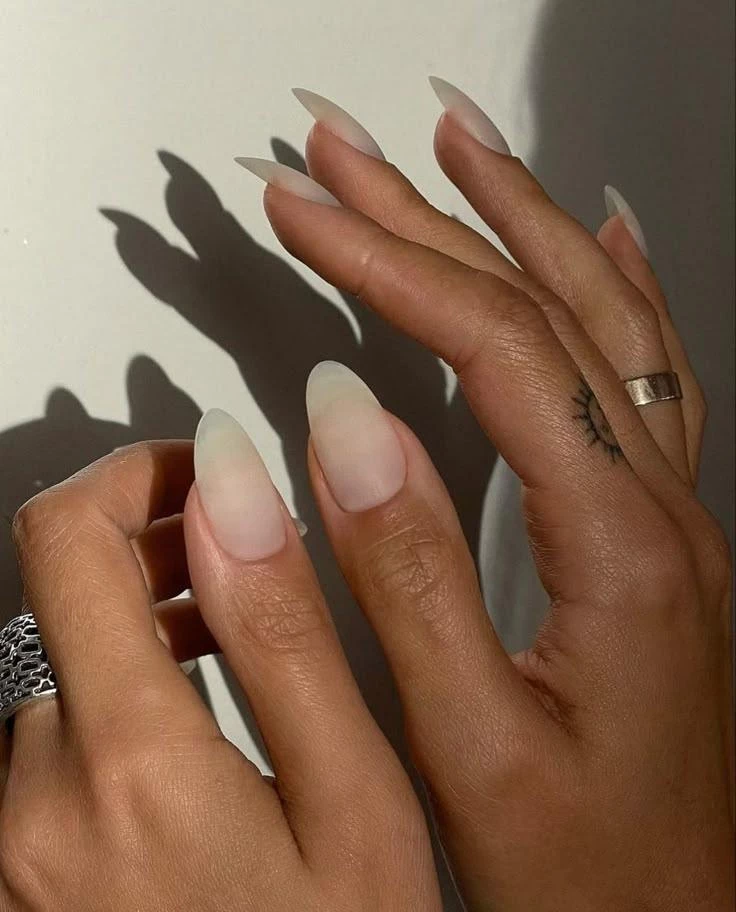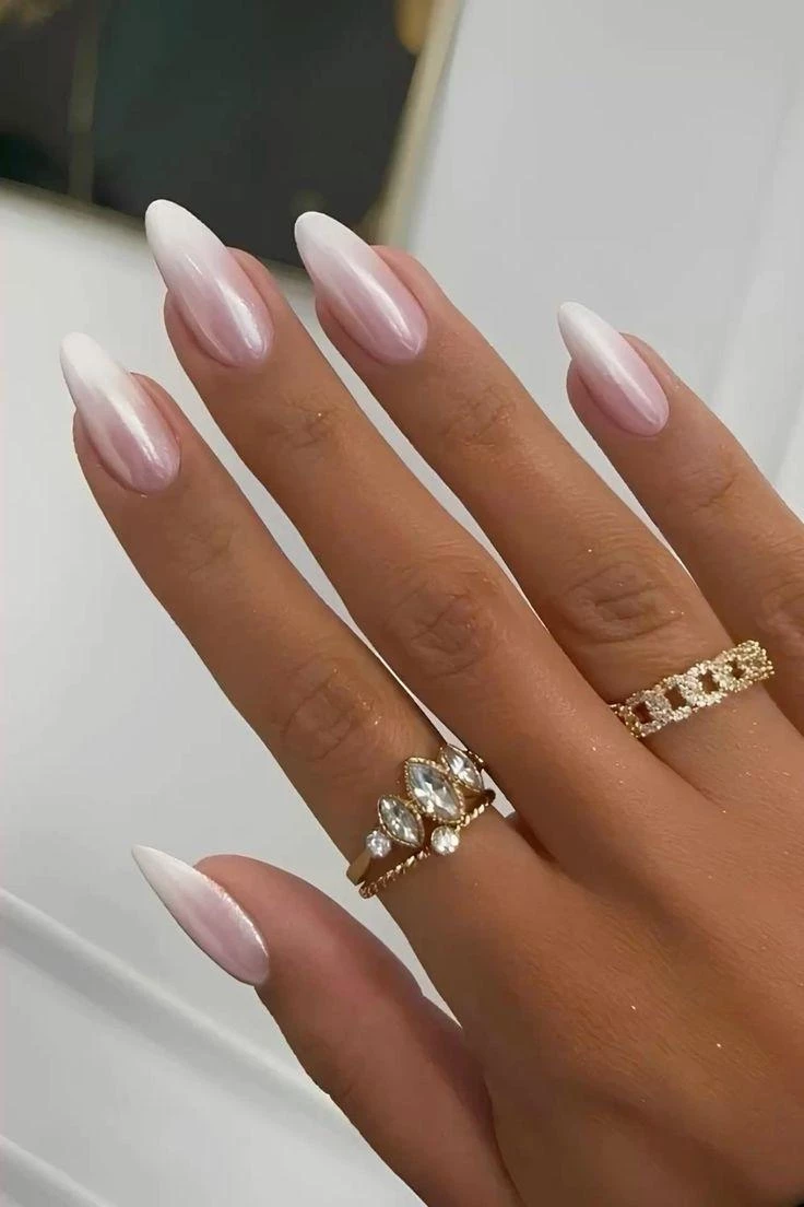 Плавный переход от молочного к бежевому или розовому напоминает легкую дымку. Такой маникюр добавляет объёма и визуальной легкости, а на овальных или миндальных ногтях смотрится особенно изысканно. Идеален для романтических и пастельных образов.