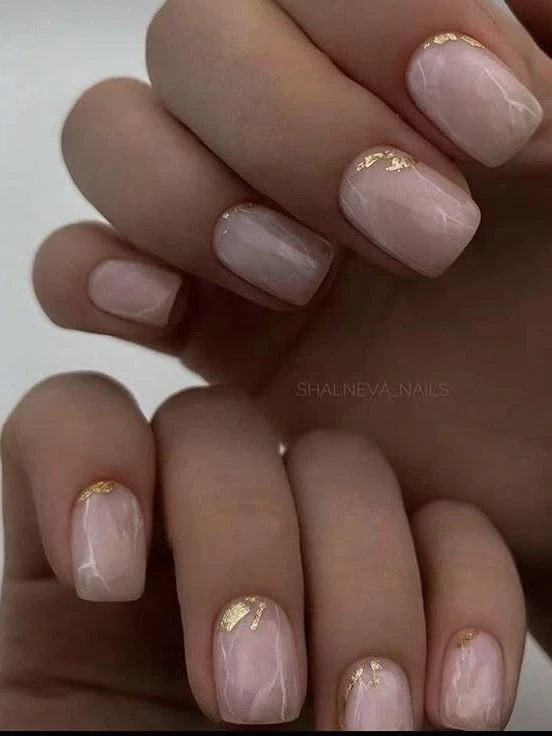 Мраморный маникюр в нежных тонах с тонкими золотыми прожилками выглядит утончённо и современно. Это идеальный вариант для невест, предпочитающих сдержанный, но выразительный дизайн, а также для платьев с геометрическими деталями или гладкими тканями.
