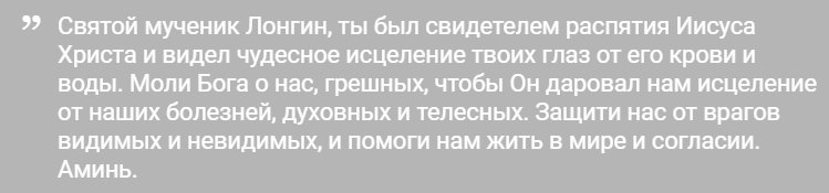 - Посетить храм и обратиться к святому Лонгину. Верующие молятся ему о здоровье и благополучии, особенно прося о помощи в исцелении болезней глаз и укреплении веры.