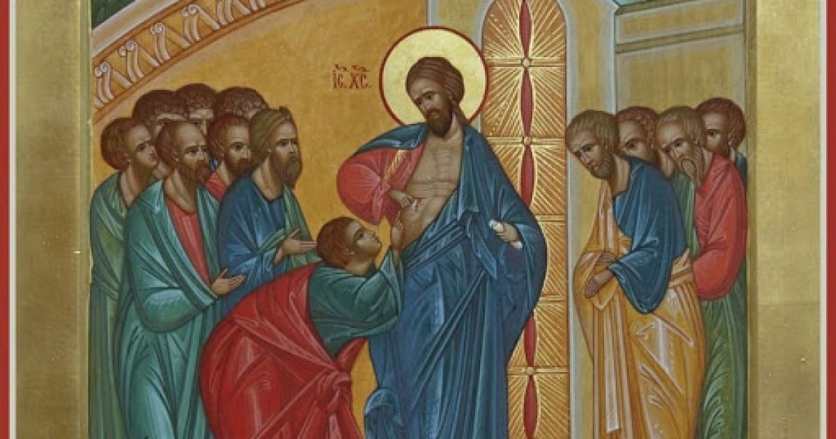 В день Пасхи Христос явился своим десяти апостолам, но апостола Фомы среди них не было. Когда остальные апостолы рассказали ему о воскресении Христа, он не поверил. Однако на восьмой день после Пасхи Христос вновь явился, проходя сквозь закрытые двери, и предстал перед всеми, включая Фому. В этот день Фома поверил в воскресение Христа, когда прикоснулся к его стороне.