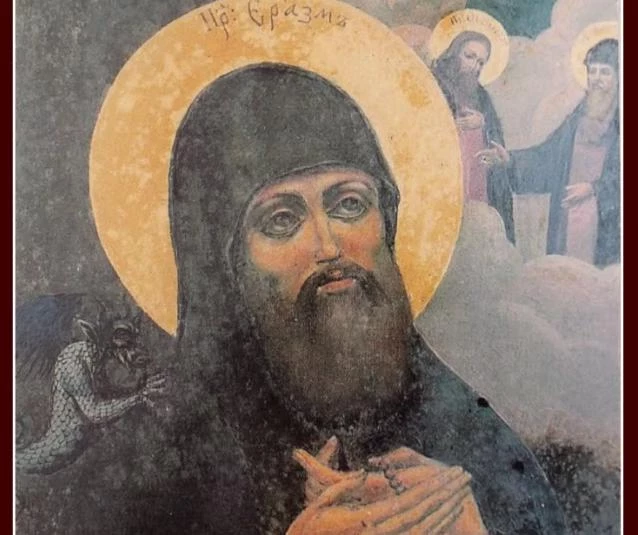 Затем он увидел Богородицу, которая указала ему путь к ангельскому образу и предсказала, что на третий день она возьмет его в Небесное Царство. Еразм исповедал все свои грехи и принял схиму. Через три дня, как было показано ему в видении, он мирно скончался. Его похоронили в Ближних пещерах Киево-Печерской лавры, где его память чтят до сих пор.