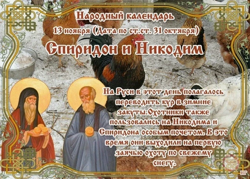 13 ноября в церковном календаре посвящён памяти святых Спиридона и Никодима, почитаемых за их праведность, смирение и помощь нуждающимся. Этот день издавна отмечали не только молитвами, но и особыми народными обычаями, соединяющими духовные и земные заботы.
