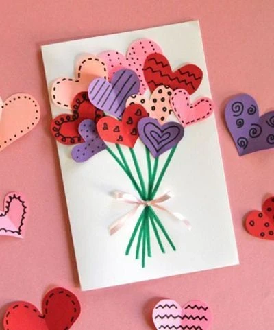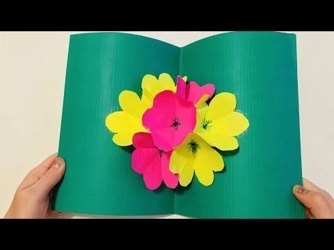 Сложите каждый лист пополам, вырежьте заготовки цветов и соедините их в объемный букет. Прикрепите композицию к цветному картону и добавьте внутри теплое поздравление.