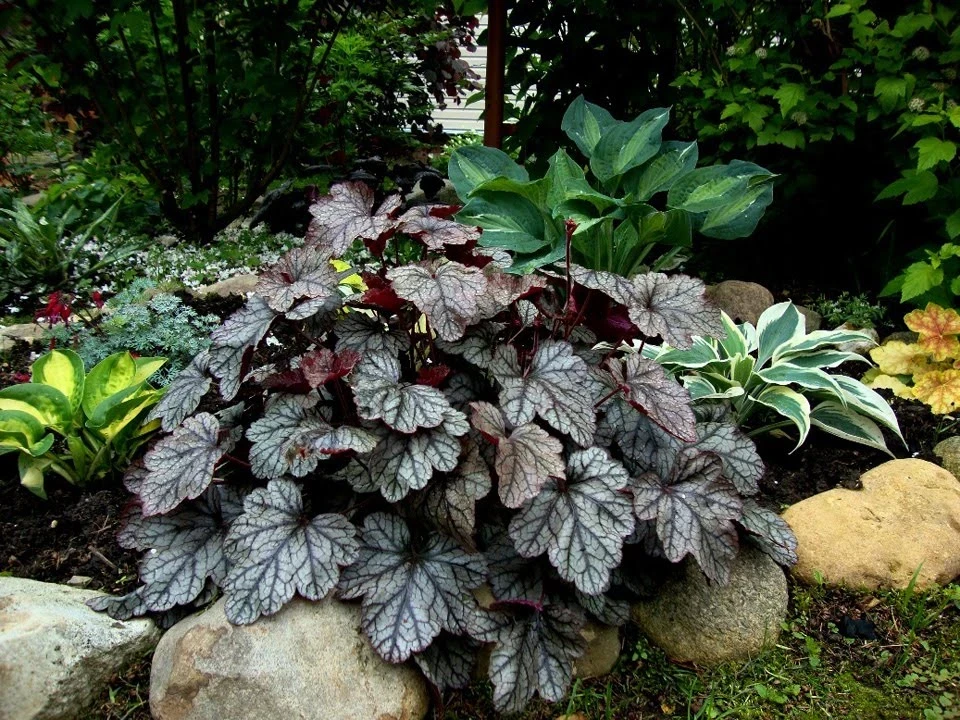 Гейхера ценится прежде всего за свою эффектную листву — от ярко-зеленой до глубокого бордового цвета. Она образует плотные кустики, которые со временем превращаются в настоящий живой ковер.