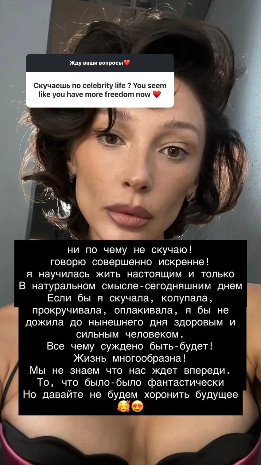 При этом Настя призналась, что с теплом вспоминает события прошлого, но считает куда важнее концентрироваться на будущем: "Мы не знаем, что нас ждёт впереди. То, что было, было фантастически. Но давайте не будем хоронить будущее".