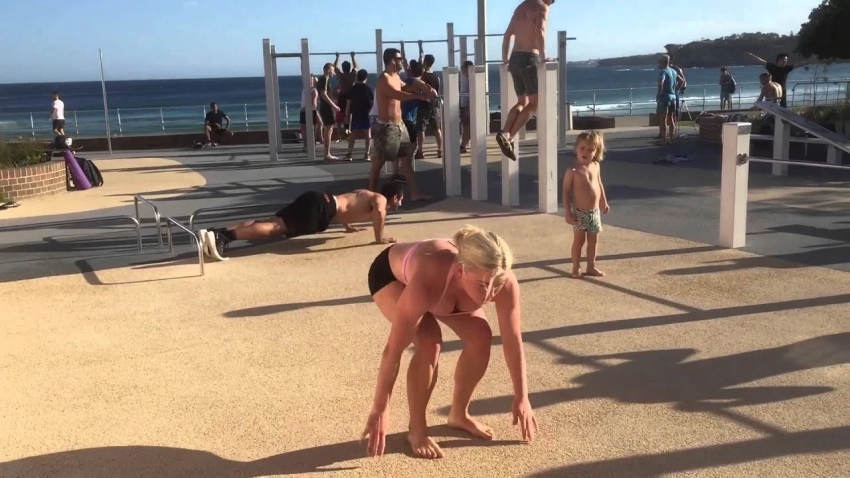 Бег в упоре на руках: ноги двигаются быстро, корпус активно работает.