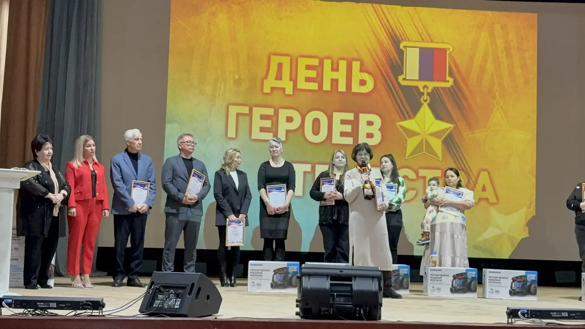 Эта дата — особая в истории России, ведь она объединяет героев всех времён: от богатырей древней Руси до современных защитников Родины. В зале присутствовали члены семей героев, которые делились трогательными воспоминаниями о своих мужьях, сыновьях и братьях, рассказывая о их подвигах, наградах и беспримерной отваге. В знак признания и благодарности семьи героев получили благодарственные письма и памятные подарки, символы памяти и уважения.