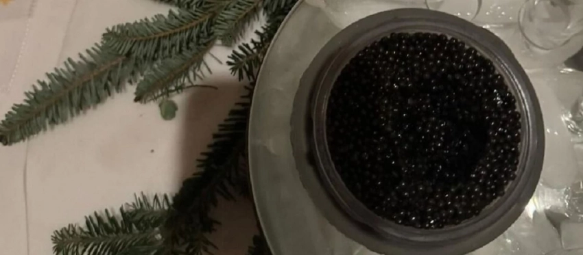 На столе знакомые каждому русскому винегрет, блины, а также ржаной хлеб и икра - не заморская, баклажанная, а настоящая чёрная.